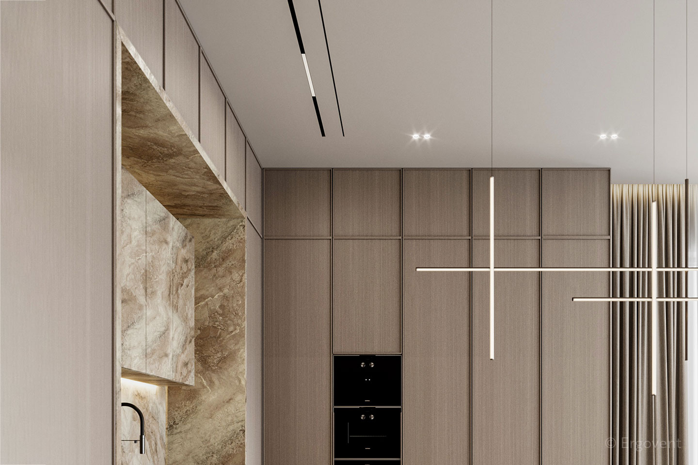 Dizaina iespējas: Pēc uzstādīšanas, difuzors ir pilnībā paslēpts zem apmetuma virsmas un nokrāsots atbilstoši pārējai platībai, veidojot viengabalainu un modernu interjeru.