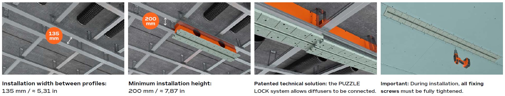 Varat izvēlēties standarta 1 m garus difuzorus vai viegli un ātri savienojamos, kas ļauj izbūvēt jebkura garuma nepārtrauktu difuzora līniju. PUZZLE difuzora fiksācijas sistēma ļauj to izdarīt ļoti precīzi un ātri. Šādu uzstādīšanu var viegli veikt viens cilvēks, jo difuzoru segmenti savienojas kā puzzle un tiek piestiprināti tieši pie ģipša griestu profiliem.
