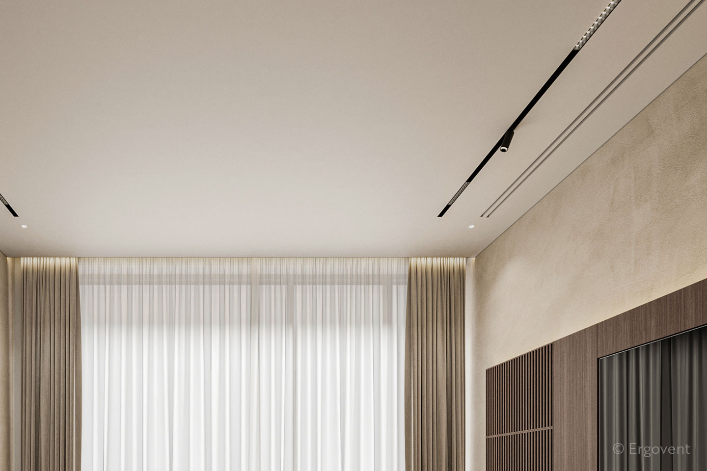 Dizaina iespējas: Pēc uzstādīšanas, difuzors ir pilnībā paslēpts zem apmetuma virsmas un nokrāsots atbilstoši pārējai platībai, veidojot viengabalainu un modernu interjeru.