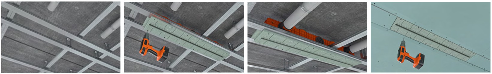 The lower part of the diffusers, which is in contact with the plasterboard, is made of recycled rigid material with gypsum-like expansion and absorption properties. In addition, plasterboards, ceiling profiles and a diffuser become one unit that moves together after fixing. This eliminates the risk of filler cracking around the diffuser after installation and long-term use.