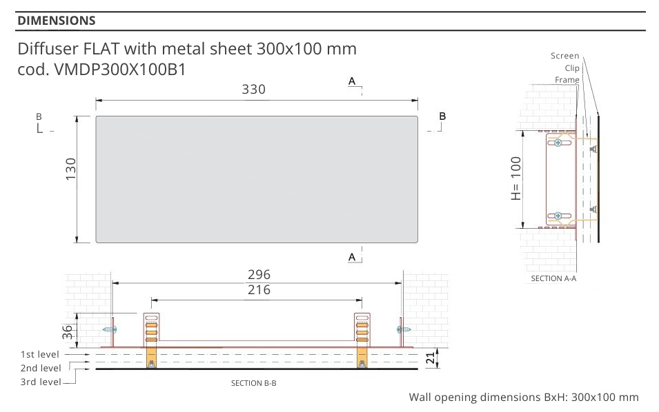 Diffuser that can be used for both air supply and exhaust; consists of a mounting grid and an aluminum frame. The frame is equipped with a perforated height-adjustable "tongue" that can be adjusted to 3 positions (with 7.5 mm spacing between them) to regulate the air flow rate. Position 0 corresponds to the closed position. The grille can be easily removed and replaced for cleaning.